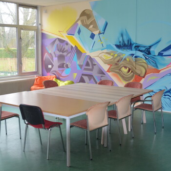 Deze ruimte kan gehuurd worden voor groepen van ca. 30 personen. De ruimte kan worden samengevoegd met ruimte 0.05b waardoor deze voor ca. 50 personen gebruikt kan worden. De totale ruimte is dan 100m2. Het gebruik van de buitenruimte die grenst aan het jeugdhonk, is inbegrepen.